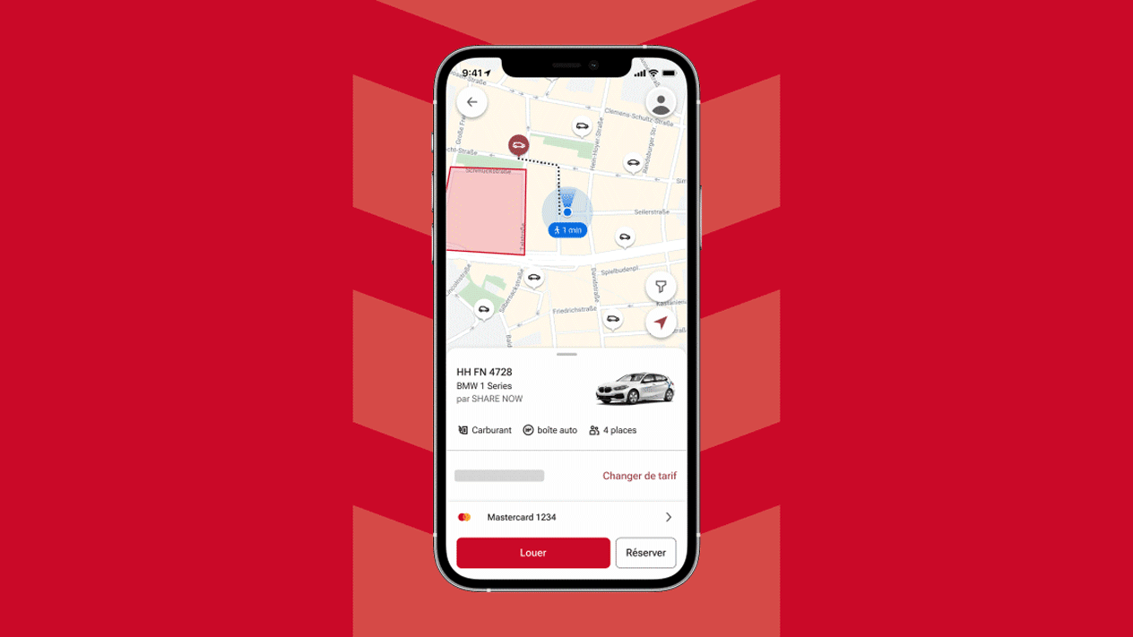 Tap ‘Carsharing’ in the app, check the in-app map and select a car nearby to rent it.